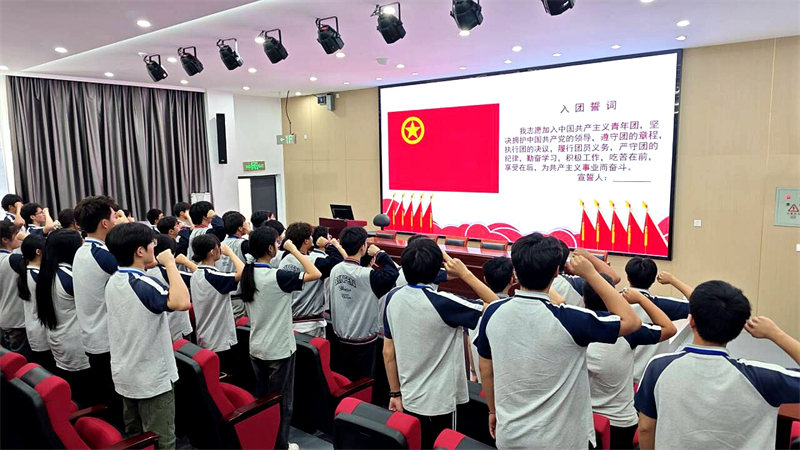 儀式在莊嚴(yán)的國歌聲中拉開帷幕。全體師生肅立,齊唱國歌,表達(dá)了對祖國的熱愛與崇敬之情。隨后,陳淼老師宣讀了新團(tuán)員名單,新團(tuán)員上臺領(lǐng)取團(tuán)員證和團(tuán)徽,全體新團(tuán)員在團(tuán)委委員程蓉的帶領(lǐng)下,面向團(tuán)旗莊嚴(yán)宣誓,鏗鏘誓言響徹禮堂,彰顯著新時代青年的蓬勃朝氣。新團(tuán)員代表在發(fā)言中表達(dá)了對團(tuán)組織的向往和加入共青團(tuán)的自豪之情,表示將以更高的標(biāo)準(zhǔn)要求自己,努力學(xué)習(xí)科學(xué)文化知識,積極參與團(tuán)組織的各項活動,為共青團(tuán)事業(yè)貢獻(xiàn)自己的力量。