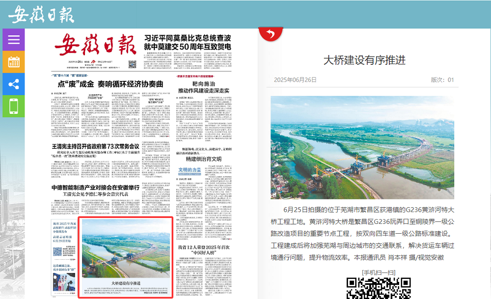 6月26日,由建工建投承建的繁昌區G236項目二標段黃滸河特大橋進入施工關鍵期,《安徽日報》首版圖片新聞報道了該項目的建設成果。